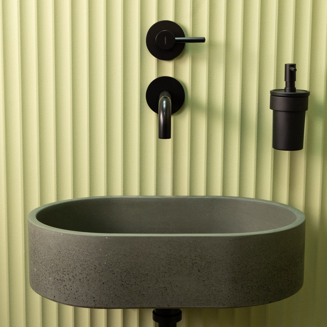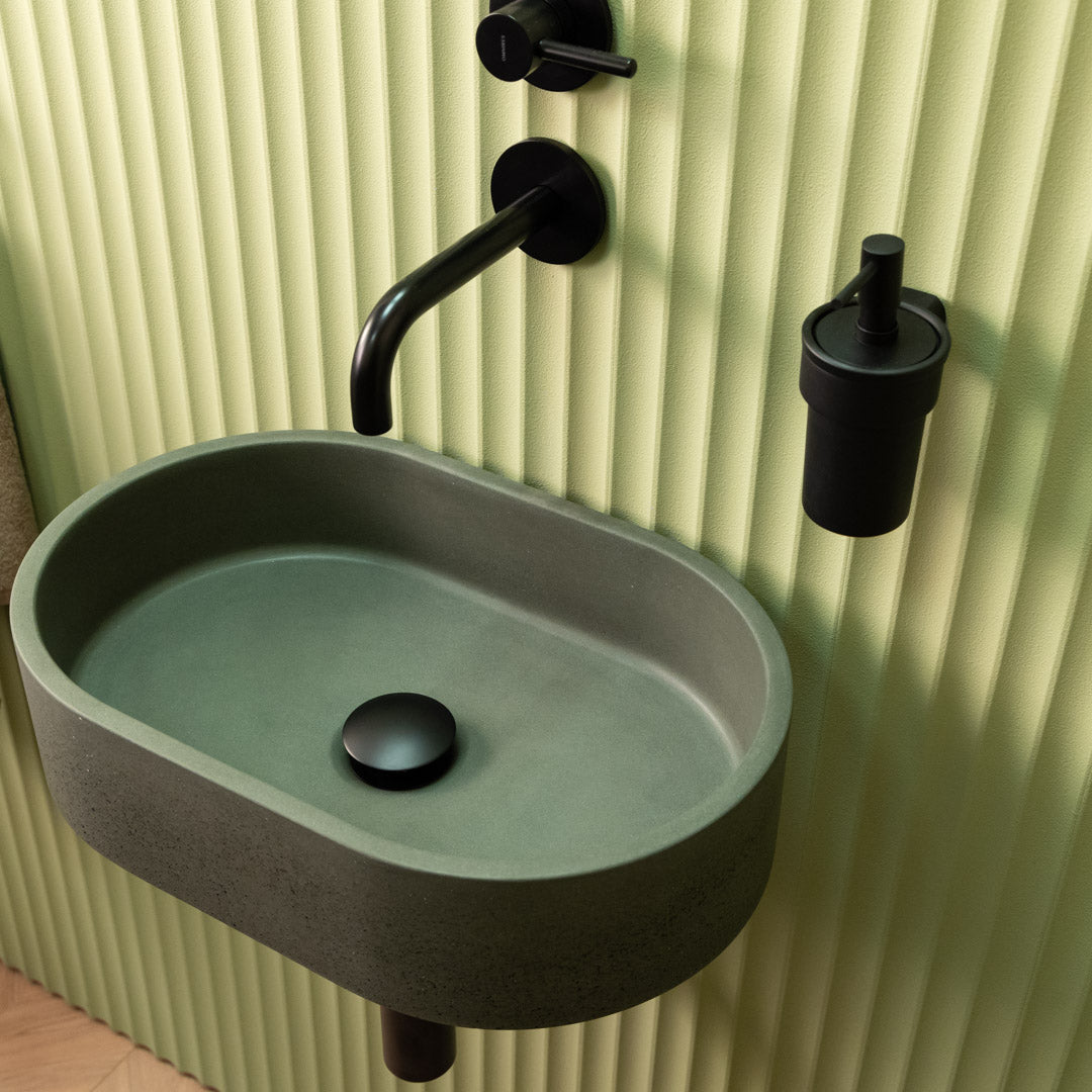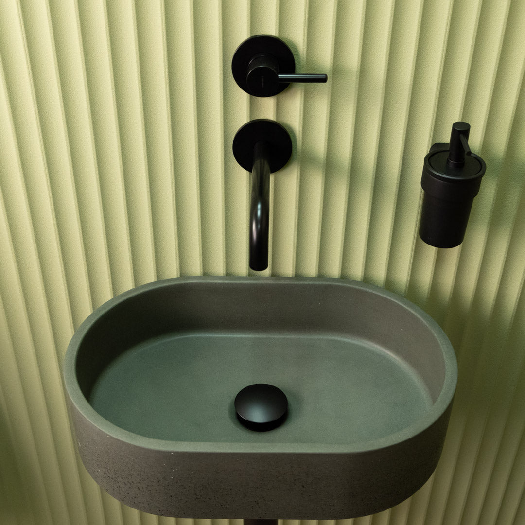 Handcrafted from premium concrete, the Mini Halo sink features a compact oval design that fits perfectly in smaller bathroom spaces. Its smooth matte finish and clean contours bring a refined, modern touch to any interior. Each basin is unique, showing natural variations in tone and texture. Designed for easy countertop installation, it offers both durability and visual balance in a space-saving format.