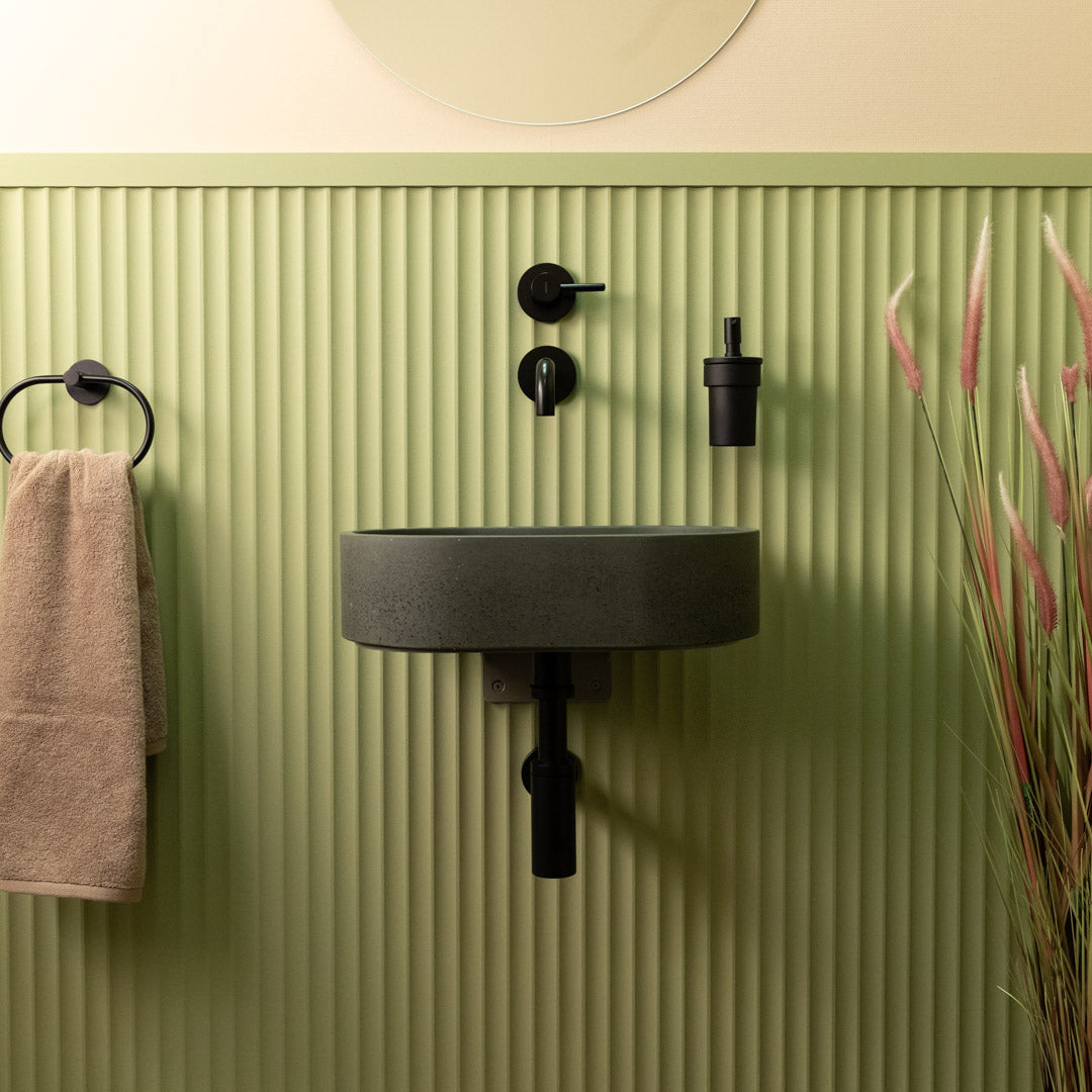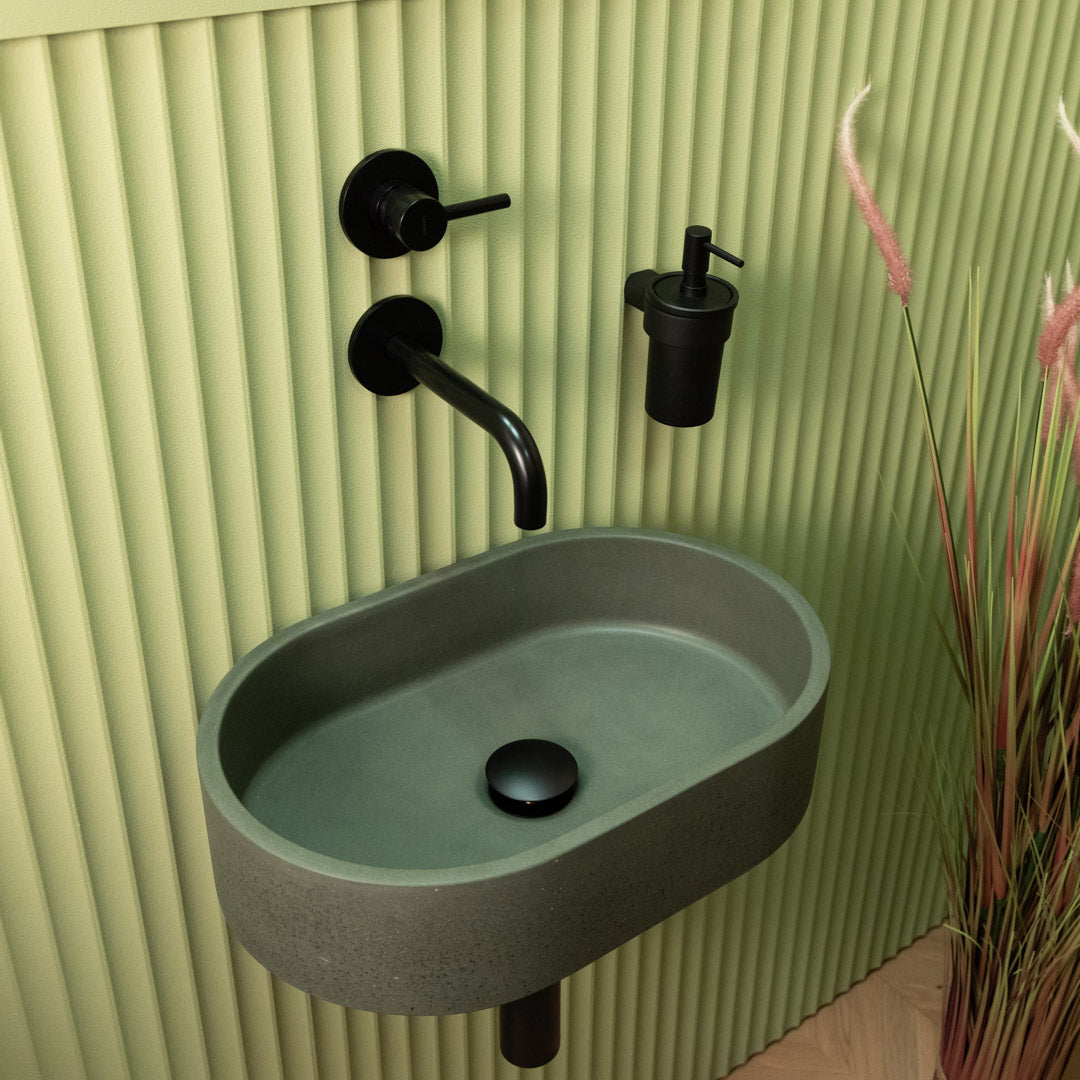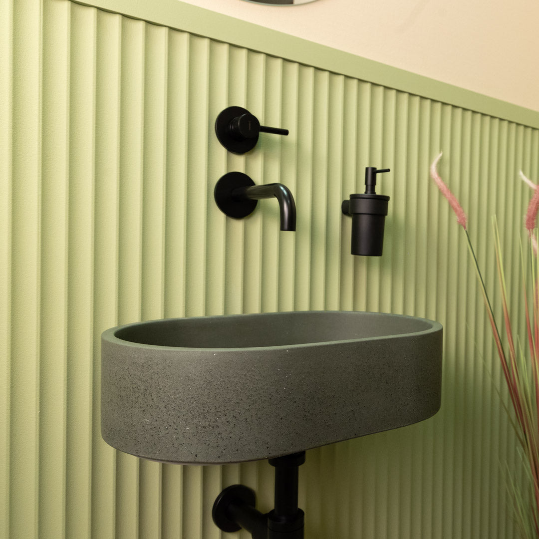 Handcrafted from premium concrete, the Mini Halo sink features a compact oval design that fits perfectly in smaller bathroom spaces. Its smooth matte finish and clean contours bring a refined, modern touch to any interior. Each basin is unique, showing natural variations in tone and texture. Designed for easy countertop installation, it offers both durability and visual balance in a space-saving format.