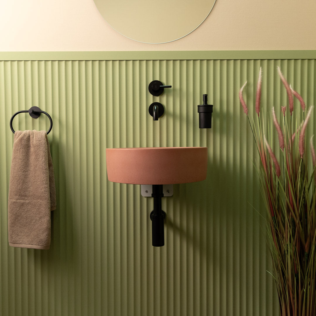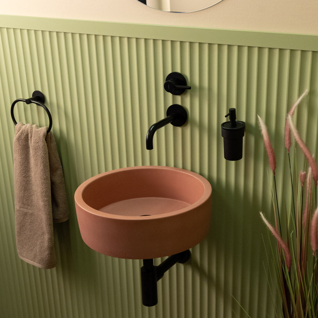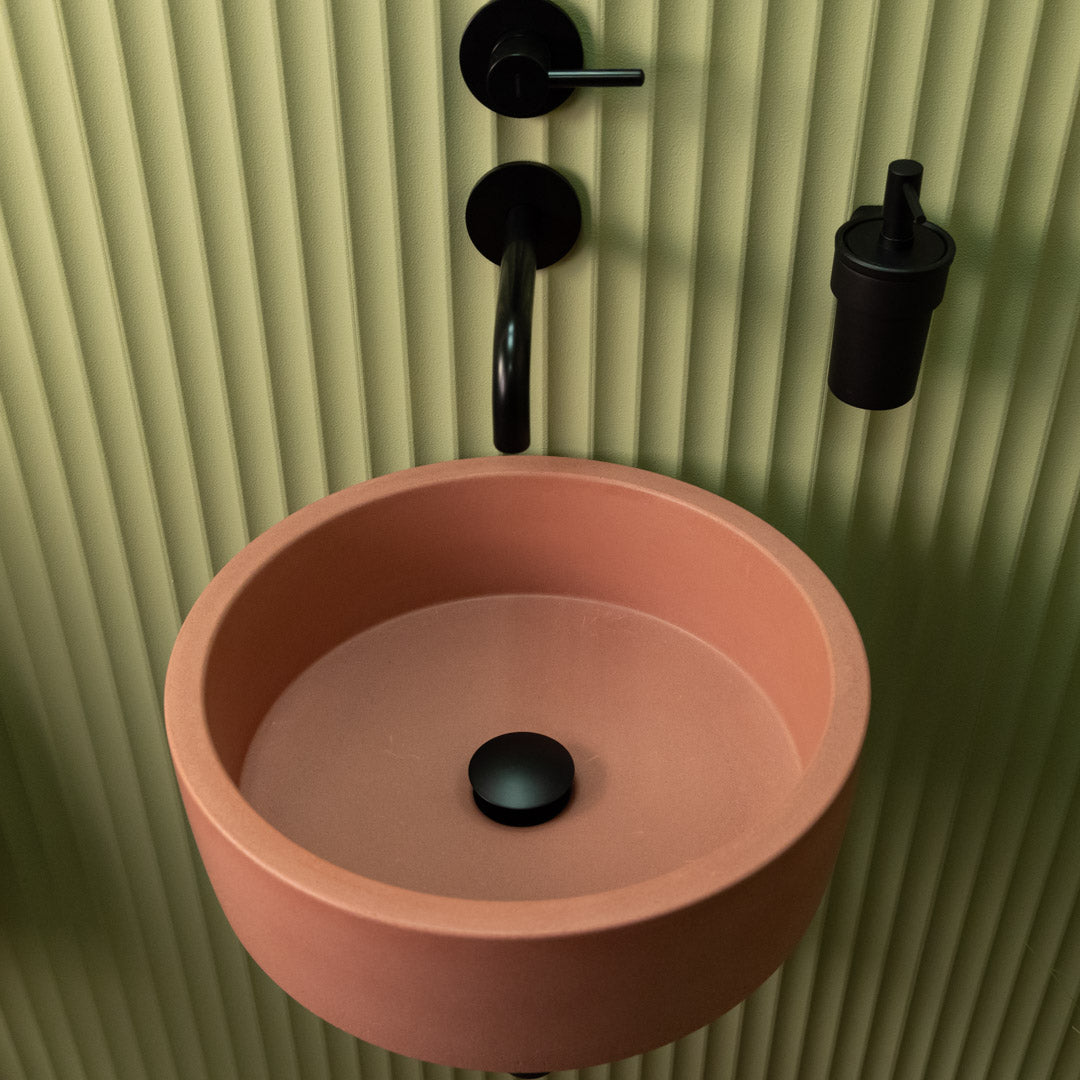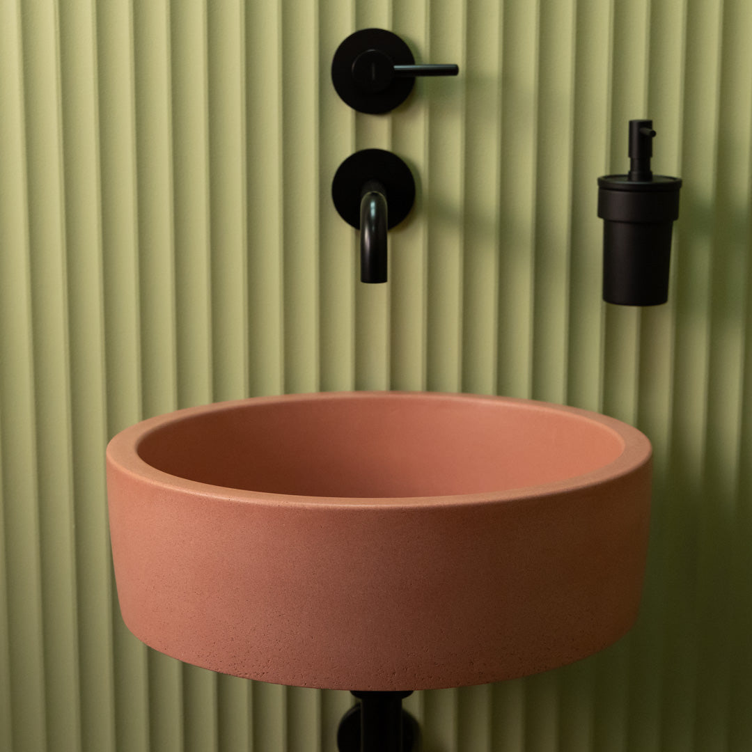 Crafted by hand from high-quality concrete, this round sink features soft edges and a smooth matte finish that suits a wide range of interior styles. Each basin is unique, displaying natural tonal variations and surface markings that emphasize its handcrafted character. Designed for easy countertop installation, it offers both durability and understated elegance for everyday use.